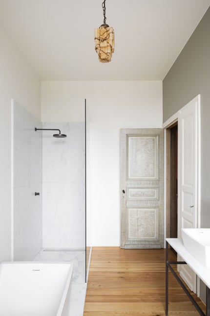 - Luxurious designer bathroom with walk-in shower, large freestanding bathtub, double sink and toilet.